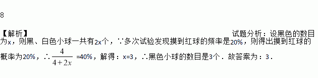 8 【解析】试题分析:设黑色的数目为x,则黑、白色小球一共有2x个,∵多次试验发现摸到红球的频率是20%,则得出摸到红球的概率为20%,∴=40%,解得:x=3,∴黑色小球的数目是3个.故答案为:3.
