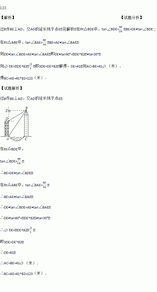 如图,小莉的家在锦江河畔的电梯公寓AD内,她家的河对岸新建了一座大厦BC,为了测量大厦的高度,小莉在她家的楼底A处测得大厦顶部B的仰角为60°,爬上楼顶D处测得大厦顶部B的仰角为30°,已知电梯公寓高82米,请你帮助小莉计算出大厦的高度BC及大厦与电梯公寓间的距离AC.