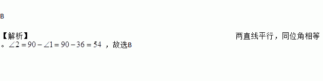 如图,把一块直角三角板的直角顶点放在直尺的一边上,如果∠1=36°,那么∠2的度数为
