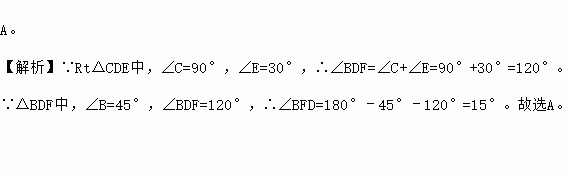 如图,一副分别含有30°和45°角的两个直角三角板,拼成如下图形,其中∠C=90°,∠B=45°,∠E=30°,则∠BFD的度数是【 】