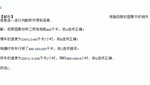 C 【解析】根据函数的图象中的相关信息逐一进行判断即可得到答案. 【解析】 观察图象知甲乙两地相距400千米,故A选项正确; 慢车的速度为150÷2.5=60千米/小时,故B选项正确; 相遇时快车行驶了400-150=250千米,故C选项错误; 快车的速度为250÷2. 5=100千米/小时,用时400÷100=4小时,故D选项正确. 故选C.