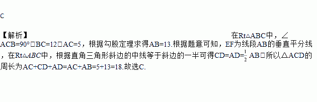 C ¡¾½âÎö¡¿ÔÚRt¡÷ABCÖУ¬¡ÏACB=90¡ã£¬BC=12£¬AC=5£¬¸ù¾Ý¹´¹É¶¨ÀíÇóµÃAB=13.¸ù¾ÝÌâÒâ¿ÉÖª£¬EFΪÏß¶ÎABµÄ´¹Ö±Æ½·ÖÏߣ¬ÔÚRt¡÷ABCÖУ¬¸ù¾ÝÖ±½ÇÈý½ÇÐÎб±ßµÄÖÐÏßµÈÓÚб±ßµÄÒ»°ë¿ÉµÃCD=AD=AB£¬ËùÒÔ¡÷ACDµÄÖܳ¤ÎªAC+CD+AD=AC+AB=5+13=18.¹ÊÑ¡C.