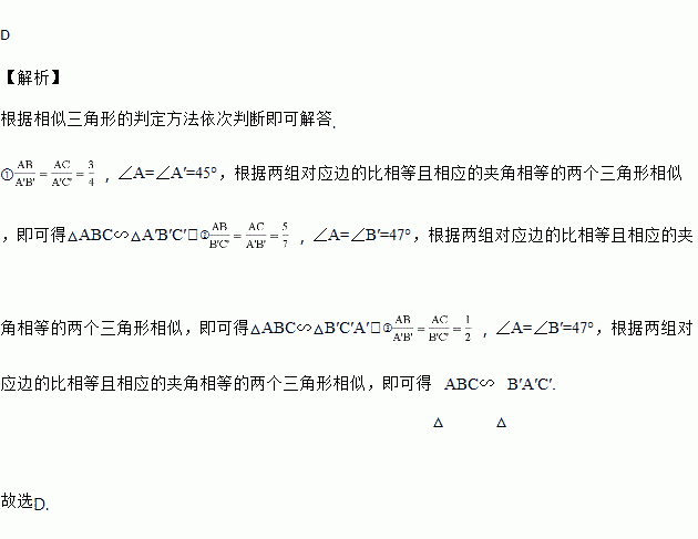 下列条件:①∠A=45°,AB=12,AC=15,∠A′=45°,A′B′=16,A′C′=20;②∠A=47°,AB=1.5,AC=2,∠B′=47°,A′B′=2.8,B′C′=2.1;③∠A=47°,AB=2,AC=3,∠B′=47°,A′B′=4,B′C′=6,其中能判定△ABC与△A′B′C′相似的有 ( )
