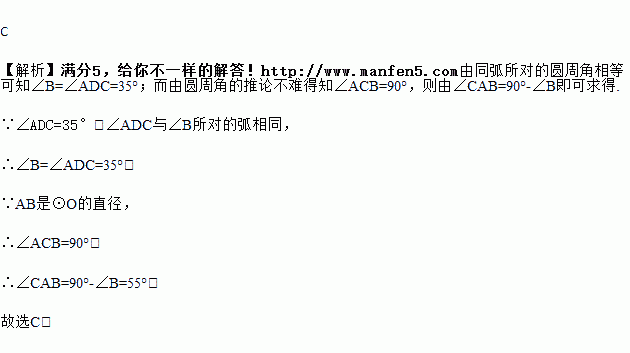 如图,AB为⊙O的直径,CD是⊙O的弦,∠ADC=35°,则∠CAB的度数为( )