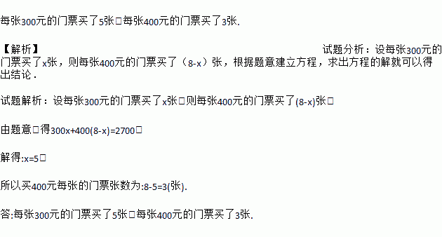 每张300元的门票买了5张,每张400元的门票买了3张. 【解析】试题分析:设每张300元的门票买了x张,则每张400元的门票买了(8-x)张,根据题意建立方程,求出方程的解就可以得出结论. 试题解析:设每张300元的门票买了x张,则每张400元的门票买了(8-x)张, 由题意,得300x+400(8-x)=2700, 解得:x=5, 所以买400元每张的门票张数为:...
