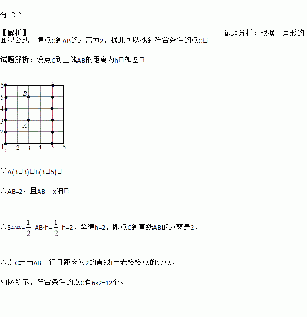 已知三角形的三个顶点都在以下表格的交点上,其中A(3,3),B(3,5),请在表格中确立C点的位置,使S△ABC=2,这样的点C有多少个,请分别表示出来.