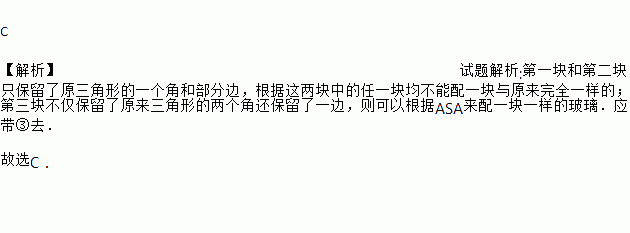 C 【解析】试题解析:第一块和第二块只保留了原三角形的一个角和部分边,根据这两块中的任一块均不能配一块与原来完全一样的; 第三块不仅保留了原来三角形的两个角还保留了一边,则可以根据ASA来配一块一样的玻璃.应带③去. 故选C.
