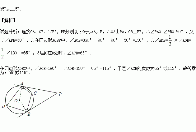 已知 P 为⊙O 外一点,PA、PB 分别切⊙O 于点 A.B,∠APB=50°,C 为⊙O 上一点(不与点 A、B重合),则∠ACB 的度数为 .