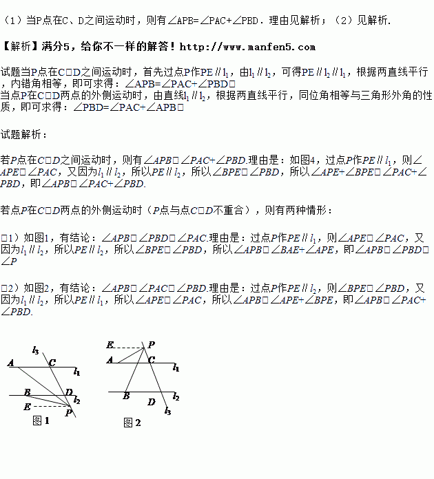 (2)若点P在C、D两点的外侧运动时(P点与点C、D不重合),试探索∠PAC,∠APB,∠PBD之间的关系又是如何?