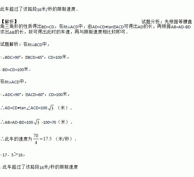 据调查,超速行驶是引发交通事故的主要原因之一.上周末,小明和三位同学用所学过的知识在一条笔直的道路上检测车速.如图,观测点C到公路的距离CD为100米,检测路段的起点A位于点C的南偏西60°方向上,终点B位于点C的南偏西45°方向上.某时段,一辆轿车由西向东匀速行驶,测得此车由A处行驶到B处的时间为4秒.问此车是否超过了该路段16米/秒的限制速度?(参考数据: