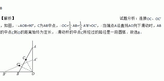 如图,在直角∠O的内部有一滑动杆AB,当端点A沿直线AO向下滑动时,端点B会随之自动地沿直线OB向左滑动,如果滑动杆从图中AB处滑动到A′B′处,那么滑动杆的中点C所经过的路径是( )