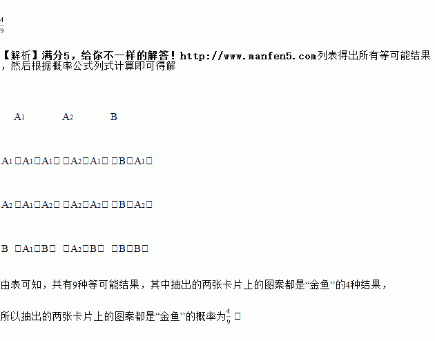 剪纸是中国传统的民间艺术,它画面精美,风格独特,深受大家喜爱,现有三张不透明的卡片,其中两张卡片的正面图案为“金鱼”,另外一张卡片的正面图案为“蝴蝶”,卡片除正面剪纸图案不同外,其余均相同.将这三张卡片背面向上洗匀从中随机抽取一张,记录图案后放回,重新洗匀后再从中随机抽取一张.请用画树状图(或列表)的方法,求抽出的两张卡片上的图案都是“金鱼”的概率.(图案为“金鱼”的两张卡片分别记为A1、A2,图案为“蝴蝶”的卡片记为B)