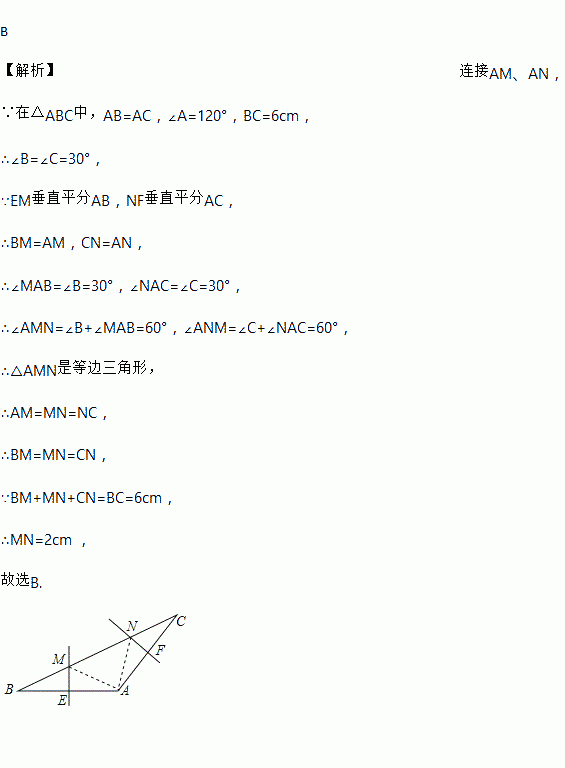 B 【解析】连接AM、AN, ∵在△ABC中,AB=AC,∠A=120°,BC=6cm, ∴∠B=∠C=30°, ∵EM垂直平分AB,NF垂直平分AC, ∴BM=AM,CN=AN, ∴∠MAB=∠B=30°,∠NAC=∠C=30°, ∴∠AMN=∠B+∠MAB=60°,∠ANM=∠C+∠NAC=60°, ∴△AMN是等边三角形, ∴AM=MN=...