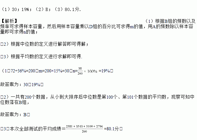 (2)这次测试成绩的中位数落在 组;