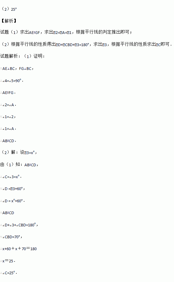 已知:如图,AE⊥BC,FG⊥BC,∠1=∠2,∠D=∠3+60°,∠CBD=70°.(1)求证:AB∥CD; (2)求∠C的度数.