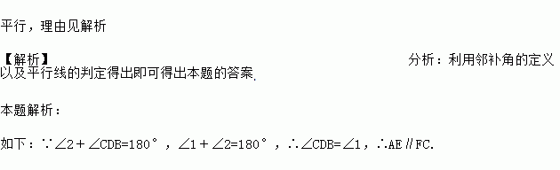 如图,∠1+∠2=180°.试问:AE与FC会平行吗?说明理由.
