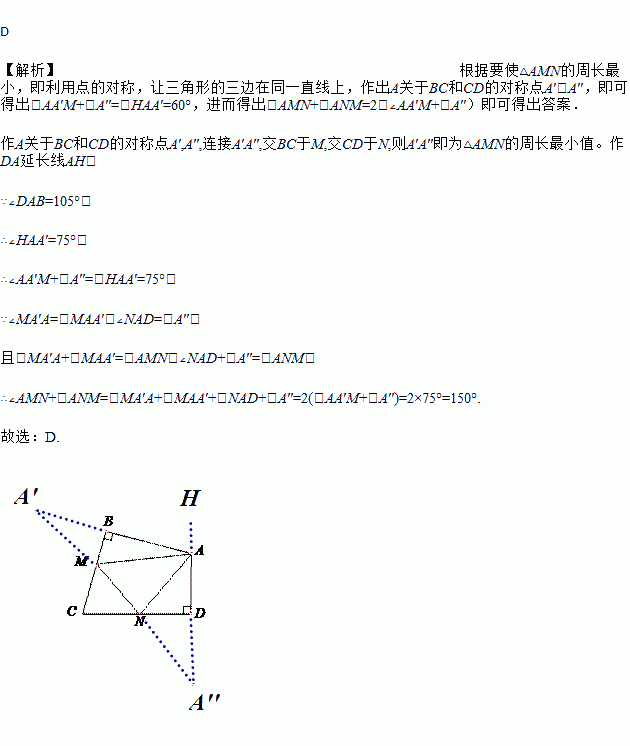 如图,在四边形ABCD中,∠B=∠D=90°,∠BAD=105°,在BC,CD上分别找一点M、N,使得△AMN周长最小,则∠AMN+∠ANM的度数为 ( )