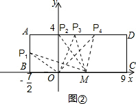 £¨2£©OMµÄ³¤ÊÇ4£¬µÈÓÚ¾ØÐÎµÄ¿í£¬ËùÒÔµãP¿ÉÒÔÊǹýO¡¢MµÄ´¹ÏßÓëADµÄ½»µã£¬Ò²¿ÉÒÔÊÇOMµÄ´¹Ö±Æ½·ÖÏßÓëADµÄ½»µã£¬ÓÖOMµÄ³¤´óÓÚOBµÄ³¤£¬ËùÒÔµãPÒ²¿ÉÒÔÔÚABÉÏ£»