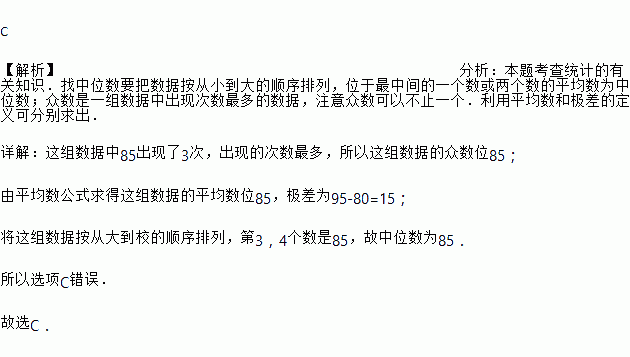 A. 众数是85 B. 平均数是85 C. 中位数是80 D. 极差是15