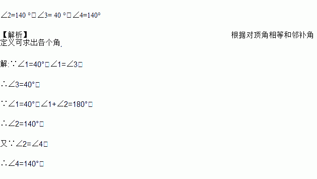 如图,直线AB、CD相交于点O,∠1=40°,求∠2,∠3,∠4的度数.