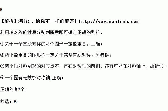 ①关于一条直线对称的两个图形一定能重合;②两个能重合的图形一定关于某条直线对称;③两个轴对称图形的对应点一定在对称轴的两侧;④一个圆有无数条对称轴.