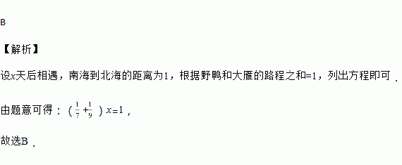 我国古代名著《九章算术》中有一个问题,原文:“今有凫起南海,七日至北海;雁起北海,九日至南海.今凫雁俱起,问何日相逢?”译文:野鸭从南海起飞,7天后达到北海;大雁从北海起飞,9日后达到南海,今野鸭和大雁分别从南海和北海同时起飞,几天后相遇?设x天后相遇,可列方程为( )