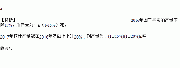 A 【解析】2016年因干旱影响产量下降15%,则产量为:a(1-15%)吨, 2017年预计产量能在2016年基础上上升20%,则产量为:(1-15%)(1+20%)a吨, 故选A.