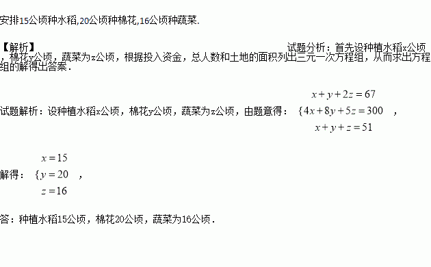 某农场300名职工耕种51公顷土地,计划种植水稻,棉花和蔬菜,已知种植农作物每公顷所需的劳动力人数及投入的设备资金如下表: