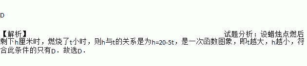 一支蜡烛长20厘米,点燃后每小时燃烧5厘米,燃烧时剩下的高度h(厘米)与燃烧时间t(时)的函数关系的图象是( )
