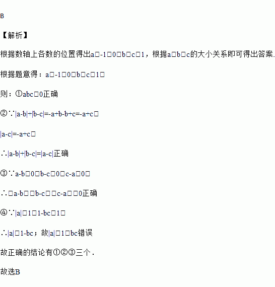 有理数 a、b、c 在数轴上对应的点的位置,如图所示:① abc<0;② |a-b|+|b-c|=|a-c|;③ (a-b)(b-c)(c-a)>0;④ |a|<1-bc,以上四个结论正确的有( )个