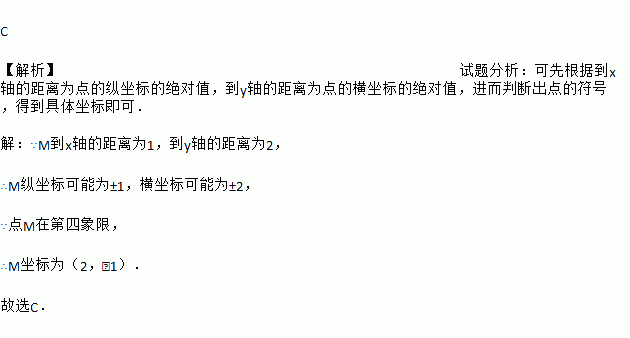 C 【解析】试题分析:可先根据到x轴的距离为点的纵坐标的绝对值,到y轴的距离为点的横坐标的绝对值,进而判断出点的符号,得到具体坐标即可. 【解析】 ∵M到x轴的距离为1,到y轴的距离为2, ∴M纵坐标可能为±1,横坐标可能为±2, ∵点M在第四象限, ∴M坐标为(2,﹣1). 故选C.