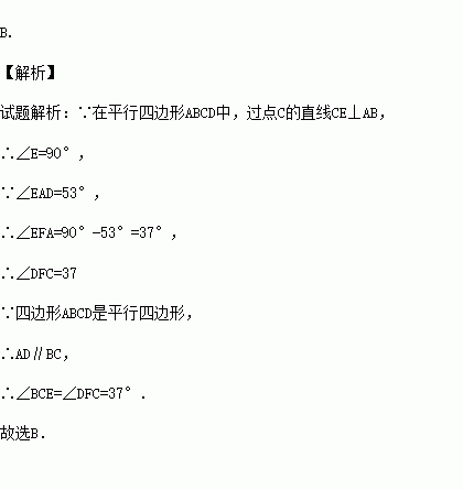 如图,在平行四边形ABCD中,过点C的直线CE⊥AB,垂足为E,若∠EAD=53°,则∠BCE的度数为( )