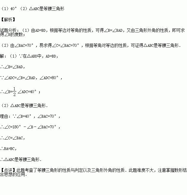 如图,D是△ABC的BC边上的一点,AD=BD,∠ADC=80°.