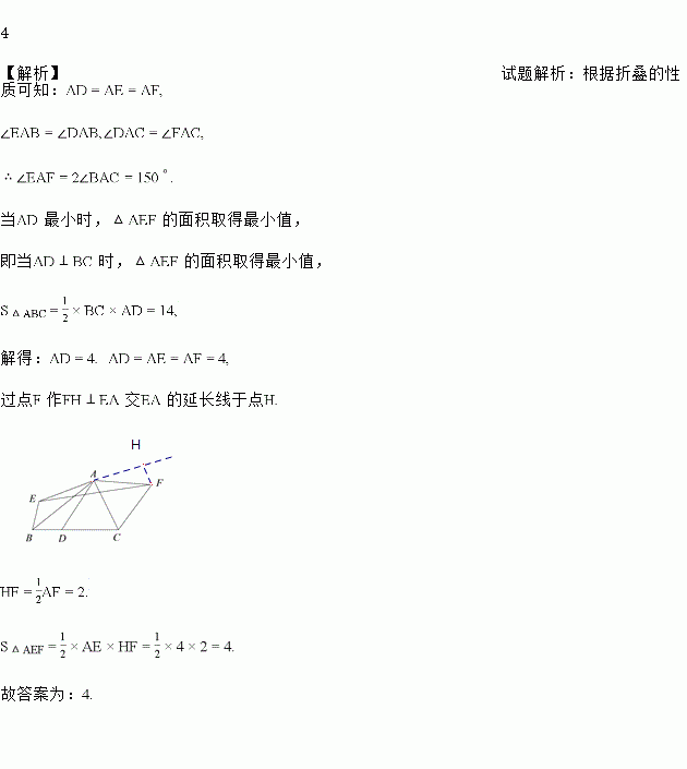 如图,△ABC中,∠BAC=75°,BC=7,△ABC的面积为14,D为 BC边上一动点(不与B,C重合),将△ABD和△ACD分别沿直线AB,AC翻折得到△ABE与△ACF,那么△AEF的面积最小值为_____.