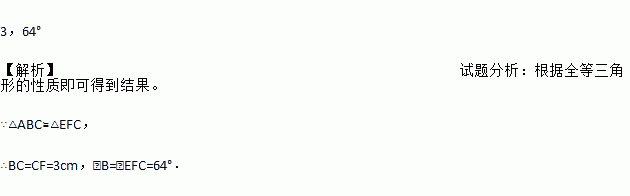 如图,若△ABC≌△EFC,且CF=3cm,∠EFC=64°,则BC=___ __cm,∠B=_ __.