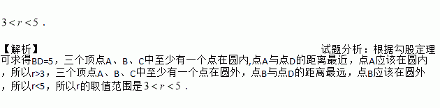 如图,在矩形ABCD中,AB=4,AD=3,以顶点D为圆心作半径为r的圆,若要求另外三个顶点A,B,C中至少有一个点在圆内,且至少有一个点在圆外,则r的取值范围是__________.