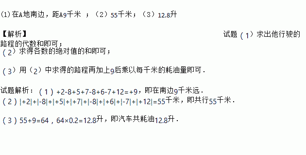 某公路检修队乘车从A地出发,在南北走向的公路上检修道路,规定向南走为正,向北走为负,从出发到收工时所行驶的路程记录如下(单位:千米):+2,-8,+5,+7,-8,+6,-7,+12.(1)问收工时,检修队在A地哪边?据A地多远?