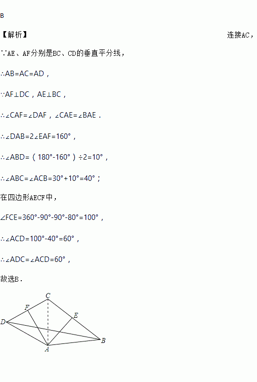 如图所示,四边形ABCD中,AE、AF分别是BC、CD的垂直平分线,∠EAF=80°,∠CBD=30°,则∠ADC的度数为( )