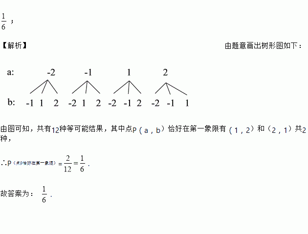 点P的坐标是(a,b),从﹣2,﹣1,1,2这四个数中任取一个数作为a的值,再从余下的三个数中任取一个数作b的值,则点P(a,b)在平面直角坐标系中第一象限内的概率是_____.