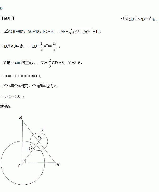 在Rt△ABC中,∠ACB=90°,AC=12,BC=9,D是AB的中点,G是△ABC的重心,如果以点D为圆心DG为半径的圆和以点C为圆心半径为