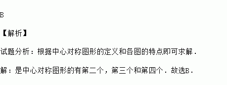 B 【解析】 试题分析:根据中心对称图形的定义和各图的特点即可求解. 【解析】 是中心对称图形的有第二个,第三个和第四个.故选B.