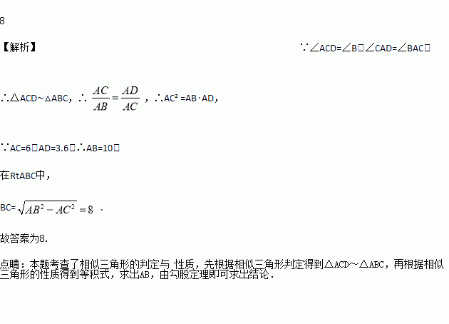 如图;在Rt △ABC中,∠ACB=90°,CD⊥AB,AC=6,AD=3.6,则BC=____