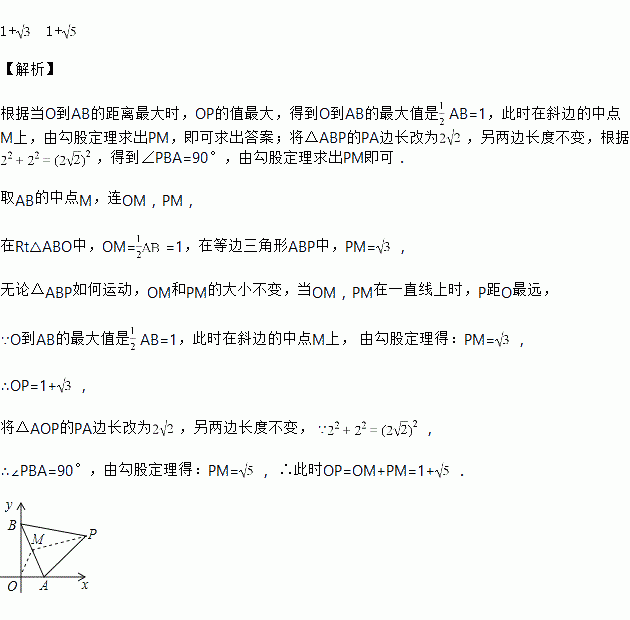 如图,点P在第一象限,△ABP是边长为2的等边三角形,当点A在x轴的正半轴上运动时,点B随之在y轴的正半轴上运动,运动过程中,点P到原点的最大距离是______;若将△ABP的PA边长改为