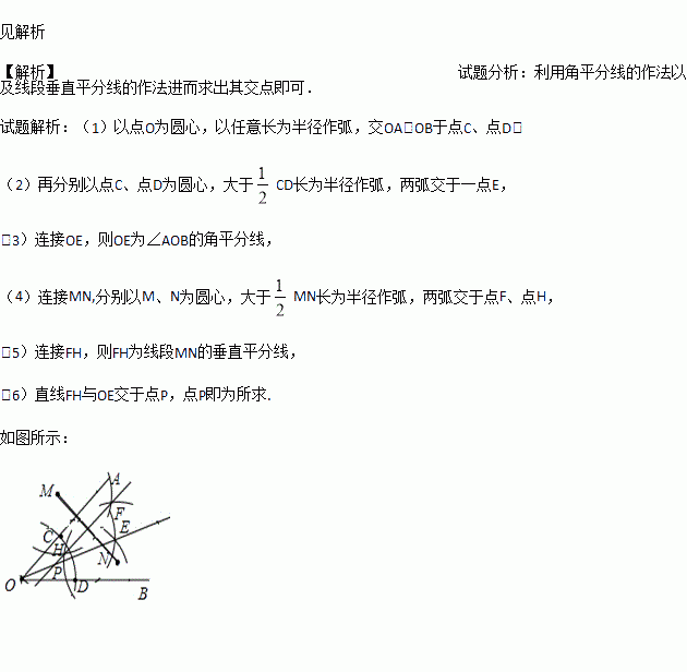如图,已知点M,N和∠AOB,求作一点P,使P到点M,N的距离相等,且到∠AOB的两边的距离相等.