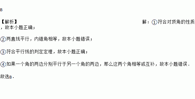 B 【解析】【解析】 ①符合对顶角的性质,故本小题正确; ②两直线平行,内错角相等,故本小题错误; ③符合平行线的判定定理,故本小题正确; ④如果一个角的两边分别平行于另一个角的两边,那么这两个角相等或互补,故本小题错误. 故选B.