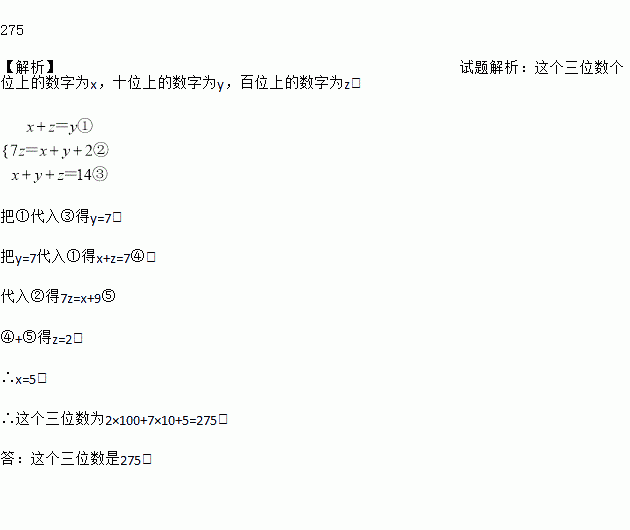 一个三位数,个位、百位上的数字的和等于十位上的数字,百位上的数字的7倍比个位、十位上的数字的和大2,个位、十位、百位上的数字的和是14.则这个三位数是__________.