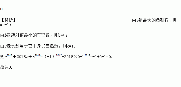 若a是最大的负整数,b是绝对值最小的有理数,c是倒数等于它本身的自然数,则a2017+2018b+c2019的值为( )
