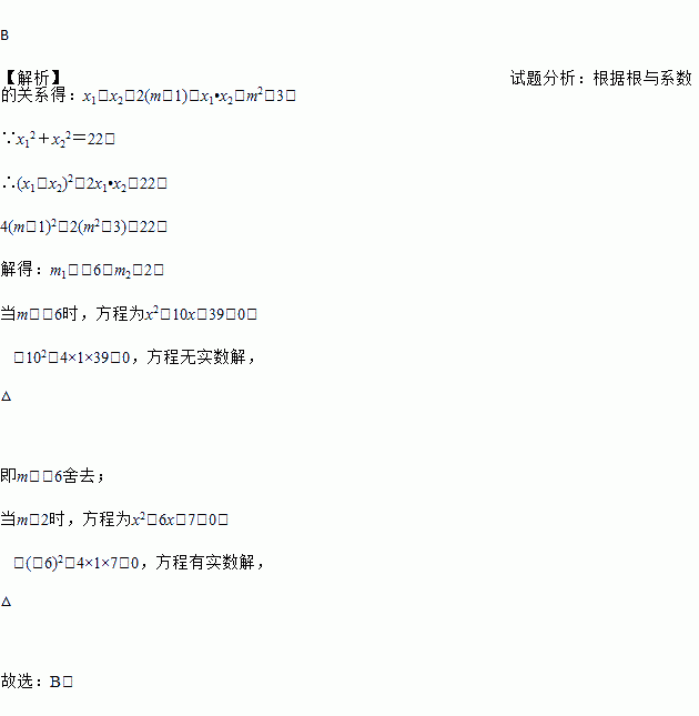 已知x1和x2是关于x的方程x2﹣2(m+1)x+m2+3=0的两实数根,x12+x22=22, 则m的值是( )