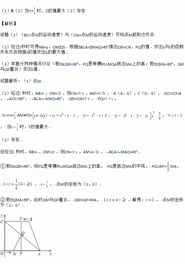 (2)求△AQM的面积S与运动时间t的函数关系式,并写出自变量t的取值范围,当t为何值时,S的值最大;