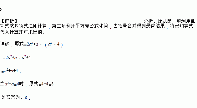已知:a2+a=4,则代数式a(2a+1)﹣(a+2)(a﹣2)的值是_____.
